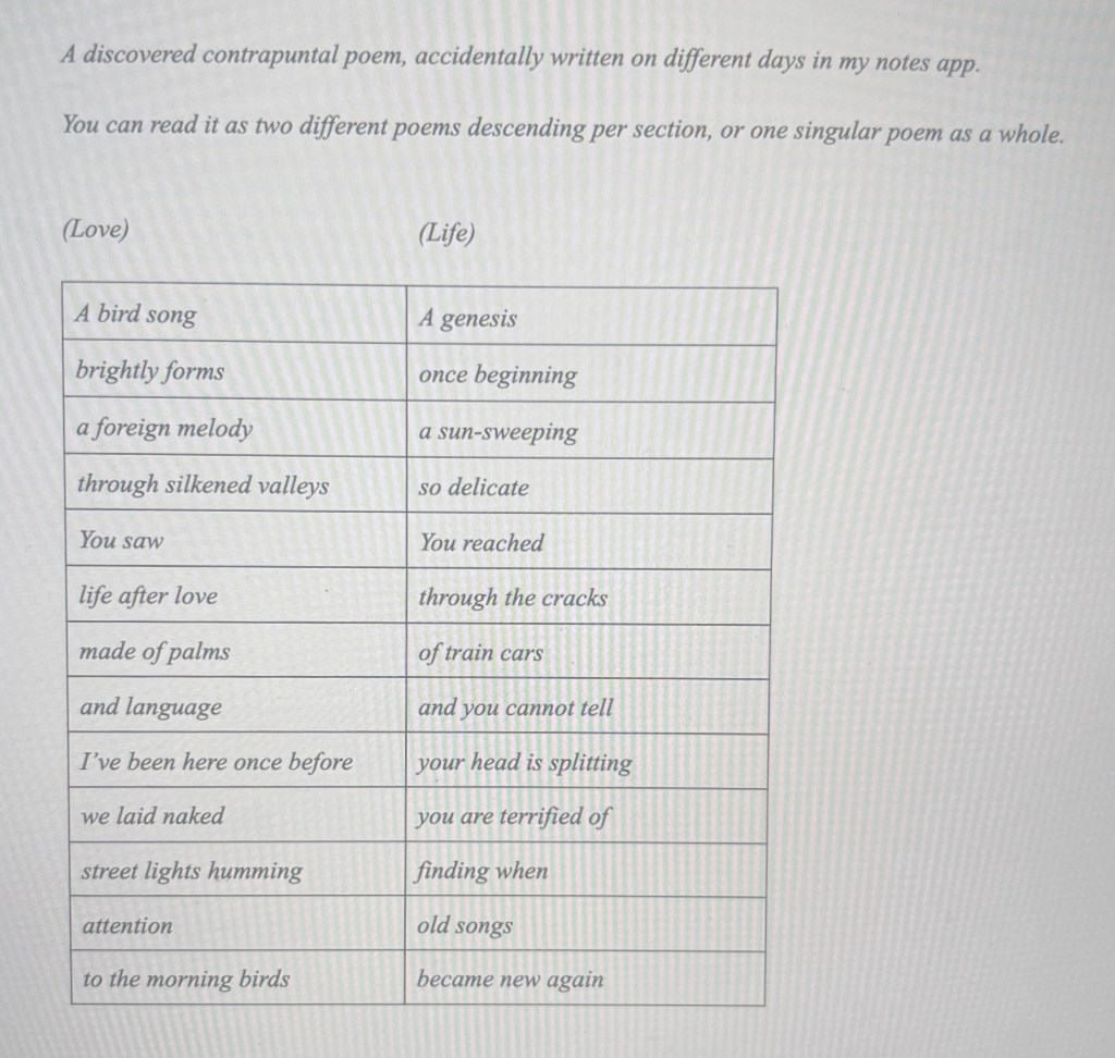 So now its just light green moss and pink birds chirping on a telephone wire. It’s tulle skirts, rice cakes, and rainbows after a pacific shower. It’s oxford commas and peeling fruits with someone you love. Sit on the river bank, let the water wash over our feet. Let’s sleep on our backs and gaze up at the popcorn ceiling.